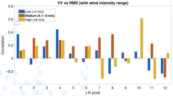The roughness variable and to what extent it affects both PLS intensity and SAR signal have been analysed by comparing RMSH index with the TLS and SAR dataset. As mentioned in Section 3.2, the RMSH index has been used as an indication of the roughness of the soil. The index has been locally evaluated for each pixel. As a first step, the correlation between the roughness and the wind has been evaluated (See Figure 13). As explained in Section 3.3, the correlation factor has been evaluated separately for low, medium and high wind speed. For the low-wind-speed condition, the correlation with RMSH is negative for almost all the pixels (up to 0.8); with increasing wind, the RMSH diminishes (lower roughness). For high wind speed, most of the pixels show positive correlation with RMSH (higher roughness).