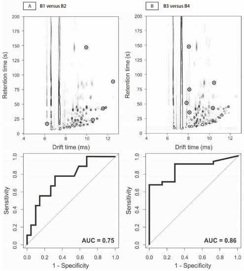 Volatile organic compound profiles and corresponding receiver-operator-characteristic curves. Here depicted, there are example outputs of the gas chromatography-ion mobility spectrometry instrument (GC-IMS; FlavourSpec®; G.A.S., Dortmund, Germany). The y-axis represents the retention time in the gas-chromatography column, while the x-axis represents the drift time through the ion mobility spectrometry column. The darkness intensity depicts the level of the measured metabolites. (A) depicts an example output of B1 versus B2, i.e., samples of biochemical remission to remission compared with samples of remission to exacerbation. In (B), an example VOC output is depicted for B3 versus B4, i.e., samples of biochemical exacerbation to exacerbation compared with samples of exacerbation to remission. In these figures, the bullets mark the locations in the VOC profiles that discriminate cases from controls. Depicted underneath the VOC profiles, there are the receiver-operator characteristic curves and the corresponding areas under the curves for these comparisons.