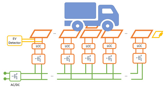Dynamic wireless power transfer systems for roadways or [2,21,22] industrial applications [23] are basically composed of an array of coils disposed along the movement direction of the receiver coil, each of them fed by a proper supply system, as depicted in Figure 1. The basic idea that is generally followed consists of turning on only the coil facing the receiver, while the others are kept off. As a result, for each receiver position, the system operates as a simple two-coil IPT apparatus and the dynamic charging is possible with the timely trigger of the coil facing the moving receiver. The coil drivers are assumed to operate at = 85 kHz, as suggested in the automotive standard regulating the static WPT systems SAE J2954 [24].
