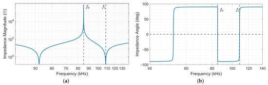 which is plotted in magnitude and phase as a function of the frequency in Figure 3a,b, respectively. The used parameters’ values are reported in Table 1. The amplitude curve in Figure 3a shows two anti-resonance peaks, below ( 52 kHz) and above ( kHz) the central 85 kHz WPT operating frequency; the rest of the discussion is then focused on the second anti-resonance without a loss of generality.
