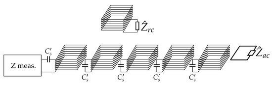 The input impedance dependency on the receiver parameters is described by the terms (11) and (12). Their effect on the function can be explained considering the system reduced to an array of i resonators, terminated with the series of the defect impedance introduced by the receiver and the equivalent impedance seen from the ith cell (corresponding to the input impedance of resonators terminated with ) as described in [32,33]. By means of , it is possible to write as: