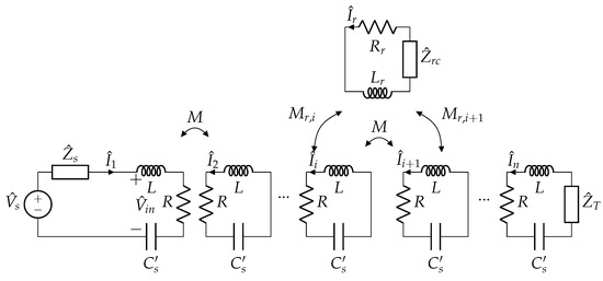 In order to write (7) in terms of the array currents only, the receiver coil current obtained from (8) can be substituted into (7). Similarly, a further reduction is also possible substituting in each equation the one relevant to the adjacent resonator, starting from the nth one. Then, (7) reduces to the KVL equation of the first resonator: