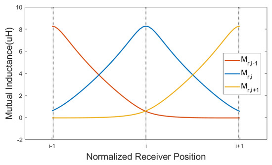 Mutual inductance between the receiver and three consecutive resonators (th, ith and th) of the array, as a continuous function of the position x.