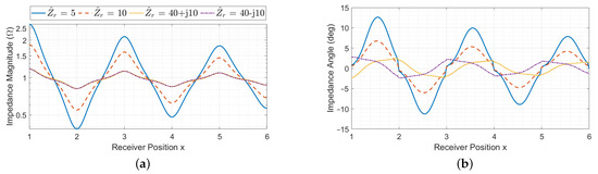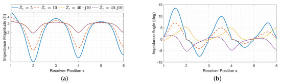 Array input impedance as a function of the receiver position with open-circuit termination for different values of the receiver impedance , in magnitude (a) and phase (b).