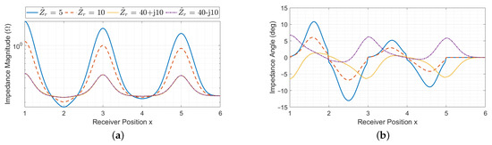Array input impedance as a function of the receiver position with matched termination for different values of the receiver impedance , in magnitude (a) and phase (b).