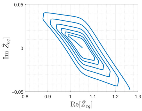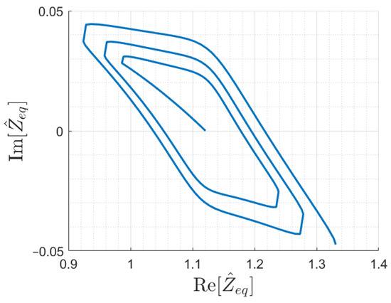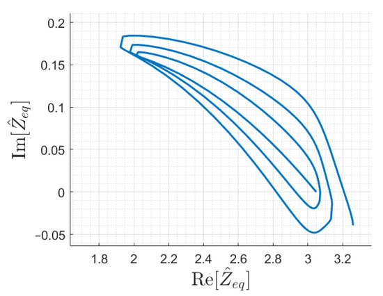 Another peculiarity of the input impedance function is its one-to-one behaviour with respect to the receiver position x. Indeed, even if both magnitude and phase of are periodic with respect to the receiver position, their combination can be unique for any x. The fulfillment of this requirements can be verified studying the trajectory of in the complex plane according to the receiver position x for certain values of , which should not present intersection points. It is plotted in Figure 10 considering the inductive receiver load of the test case and . The plot shows that intersections might occur, and, in that case, the value of would correspond to different x positions.