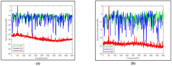 Specified frequency periodic signals are set up as 50 Hz, and the sampling frequency is set up as 1 kHz. We consider a signal with center frequency = 50 Hz as presented above with random white noise. In Figure 2, the curve, denoted by “SDV”, is compared with the classical FFT results and the “DCV” in [] with an input SNR of −10 dB and −20 dB, respectively.