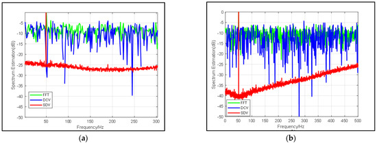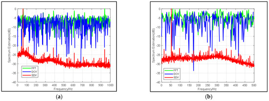 Comparison of frequency spectrum estimation results from FFT (blue line), DCV (green line) and SDV (red line) with (a) SNR = −10 dB and (b) SNR = −20 dB.