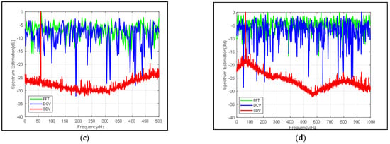 Comparison of frequency spectrum estimation results from FFT (blue line), DCV (green line) and SDV (red line) with same snapshots but different SNR: (a) SNR = −20 dB, (b) SNR = −22 dB, (c) SNR = −24 dB, (d) SNR = −26 dB.