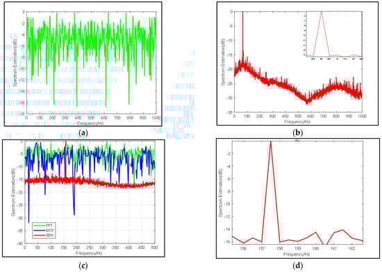 (a) Results from FFT under −26 dB, (b) Results from SDV using the same data with (a), (c) Comparison of frequency spectrum estimation results from FFT (blue line), DCV (green line) and SDV (red line) under SNR = −26 dB, (d) Zoom in on the spike of (c).