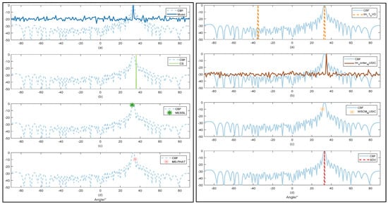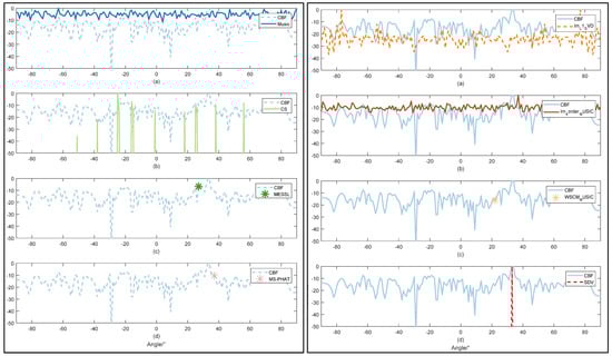As shown in Figure 7 and Figure 8, the DOA spectrum of CBF shows a poor resolution under the SNR = −10 dB and can hardly detect the direction when the SNR value is −20 dB. MUSIC detects target direction with much lower resolution and more interference compared with Figure 6. Remaining to be both high-resolution, as CS shows in both figures, however, low SNR value obstructs accuracy of OMP method. Through SDV, the accurate direction can be detected with high-frequency resolution. In addition, within the observation range of the figure, sidelobes are almost completely suppressed.