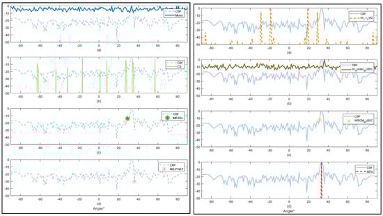 Comparison of direction estimation with SNR = 10 dB by 9 methods: CBF worked as a comparison in all figures. Music are shown in left (a) CS are shown in left (b). MESSL are shown in left (c) and MS-PHAT are shown in left (d). Im-L1-SVD are shown in right (a). Im-4order-MUSIC are shown in right (b). WSCM-MUSIC are shown in right (c) and proposed SDV are shown in right (d).