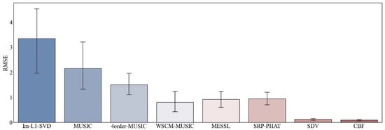 For each SNR value, we conducted 10 experiments with different methods. In order to demonstrate the advantages of our algorithm, we focus on the case of negative SNR. RMSE of all methods with the input SNR of −10 dB are plotted. As simulated above, due to the capacity to suppress sidelobes and acquire a high direction resolution, we conclude that the SDV method is suitable to detect weak signals.