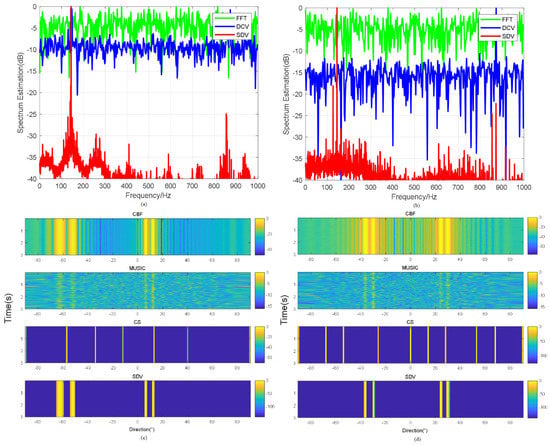 Figure 8 shows the frequencies transmitted from the experimental data with ocean background noise and the Bearing Time Recording (BTR) of different methods. Comparison between SDV and FFT show that DCV can provide higher frequency resolution and reduce the influence from sidelobes in Figure 10a,b, while pre-process of SDV provide a much higher noise suppression. The output SNR of Figure 8a reaches 38 dB higher than FFT and 28 dB higher than DCV by means of SDV method. Applying the frequency in beamforming, as shown in Figure 10c,d, the direction of arrivals is detected. Details of beamforming are illustrated in Table 3.