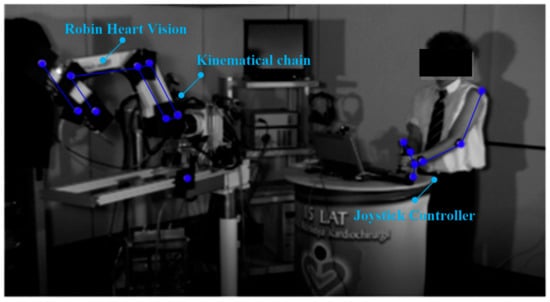 Robin Heart Vision surgical robot for soft tissue surgery and joystick controller and robot operator with reflective markers attached to the biokinematic chain.
