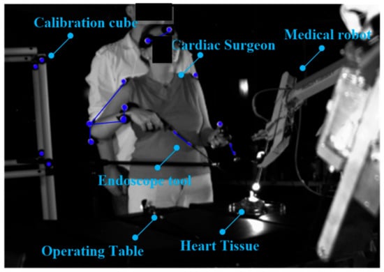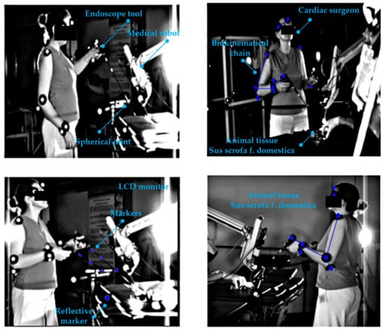 A surgeon operating upon a cardiovascular tissue (Sus scrofa F. domestica) preparation with endoscopic tools is illustrated in the Figure 4 and Figure 5. Herein, the surgeon observes the operated tissue on a monitor, which is viewed from the endoscopic camera of the Robin Heart Vision used for this purpose. The surgeon’s movement is recorded at 100 [Hz], using the four digital sensors of an CMOS Basler A602fc-2. The conditions of the in vitro experiment on cardiovascular tissue closely correspond to the true situation of minimally invasive heart surgery. The medical trocar was simulated by means of a spherical joint, actual endoscopic tools employed in performing operations were exploited, the clinically tested Robin Heart Vision medical robot was used, the cardiovascular tissue was on a professional operating table, the operation was performed by an experienced cardiac surgeon with many years of experience. In view of the above, one should be convinced that the obtained kinematic parameters based on the data from the optical sensor system correspond to those that appear during surgery on the pathologically changed tissue of the patient. This work may be of interest to designers of state-of-the-art devices such as medical robots.
