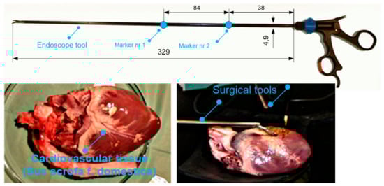 During the experiment, two endoscopic tools with two markers were used to perform set-up and positioning activities on the cardiovascular tissue shown in Figure 6. The endoscopic tools had four degrees of freedom after passing through the access port. The described configuration of the degrees of freedom can be read from Figure 7.
