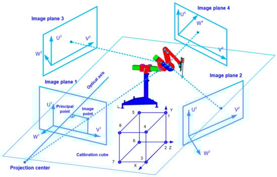 The DLT (direct linear transformation) algorithm was employed in order to obtain spatial data by applying a system of four CMOS matrices [,]. The X, Y, Z coordinates with which the trajectory of the marker attached to the analyzed mechanical object can be obtained, are related to the calculation of the U and V coordinates of the optical sensor. The U and V coordinates are associated with 11 parameters, the values of which are calculated in the calibration procedure: