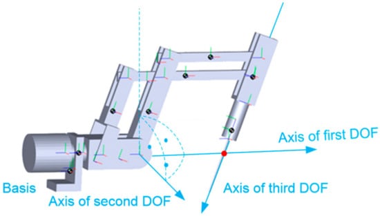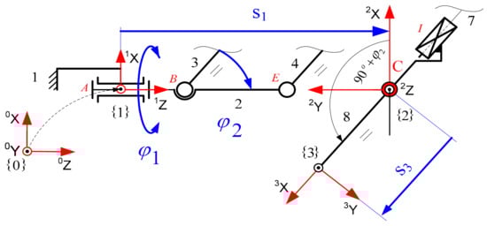 The kinematic chain of a surgical robot with three degrees of freedom is illustrated in Figure 8. The first two degrees of freedom in the robot are responsible for rotational movements , . The third degree of freedom is responsible for the translational movement of the endoscopic instrument . The robot mechanism shown in Figure 9 is called a “remote center of motion (RCM) mechanism”.
