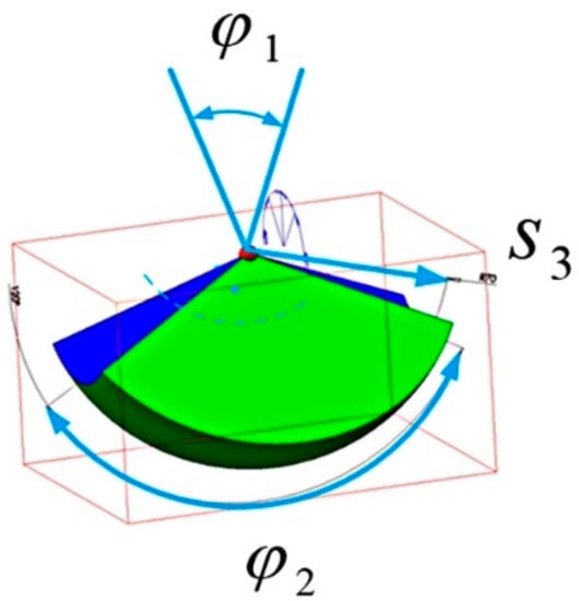 The spherical shape of the working space obtained by the remote center of motion mechanism of a surgical robot. The joints variables are: , , .