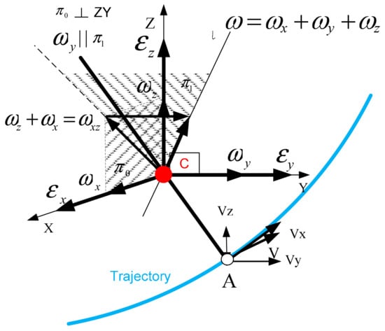 where: , ,  are components of the velocity vector  relative to the coordinate system in the constant point C; ωx, ωy, ωz are components of the rotational velocity vector  relative to the coordinate system in the constant point C; rx, ry, rz are components of radius vector  relative to the coordinate system in the constant point C.