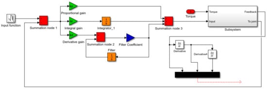 The block diagram, which was created on the basis of Equation (10), describing the PID controller model is illustrated in Figure 14.