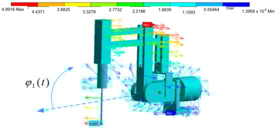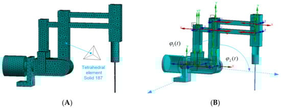 The transient dynamics model was built using the FEM mesh method. This mesh model has 11,832 degrees of freedom. The discretization is performed through applying the Solid 187 element []. The motion model of the robot was created from links connected by kinematic rotational pairs. Both structures are shown in Figure 15.