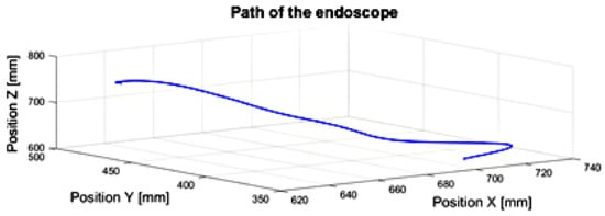 Based on the trajectory of the endoscopic tool during the tool positioning movement against the heart tissue in the in vitro surgery, other kinematic parameters of the tools, important from the point of view of endoscopic surgery, were determined. The trajectory of the endoscopic tool is illustrated in Figure 16. The tool passes through a simulated spherical trocar joint. The surgeon does not directly observe the heart tissue, rather, the image of the heart is delivered to the monitor by the endoscopic camera of the surgical robot, “Robin Heart Vision”. Based on the obtained results, it is possible to objectively assess the surgeon’s technical abilities to perform endoscopic surgery.