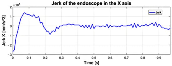 The jerk-like course of the endoscopic tool along the X−axis obtained on the basis of the course of acceleration—which is not constant in terms of value.