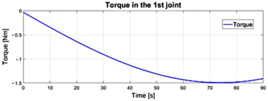 The value of the driving torque in the first degree of freedom of the numerical model made in the Simulink program for the input equals to ω1 = 1.3 [deg/s]. This is determined as the maximum during the positioning movement in relation to the heart tissue after the endoscope passes through the access port, which is illustrated in Figure 20. Herein, the maximum value of ω2 was 2.75 [deg/s], while  was equal to 0.27 [cm/s]. The course of the driving torque in the second degree of freedom is illustrated in Figure 21. The paths of the driving torque in the first and second degrees of freedom are periodic. Based on the obtained driving torque, it is possible to select the driving system of a surgical robot with a remote center of motion mechanism.
