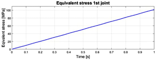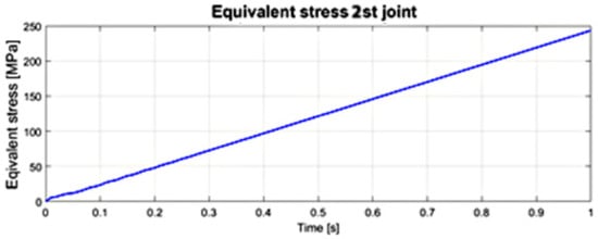 The courses of the maximum values of stress reduced according to the von Mises hypothesis, obtained at any time in the transient analysis of the numerical model in the first and second joints of the surgical robot are illustrated in Figure 22 and Figure 23. The significance of the reduced stress is substantial in the case of the surgical robot’s effort (danger of reaching a critical state) by reaching the yield point in the case of a complex stress state. The von Mises hypothesis, where the effort is measured by the shear strain energy, gives results close to the experimental and is applied to elastic-plastic materials [,].