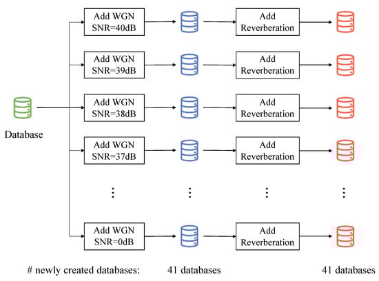 For each of the previously mentioned scenarios, another 41 databases are generated based on the original 528 audio files, adding the corresponding type of noise ranging from 40 dB signal-to-noise ratio—representing a nearly clean speech from a human hearing capability perspective—to 0 dB, which involves the incorporation of a considerable noisy level. Figure 2 shows an example of the followed procedure for one of the four scenarios.