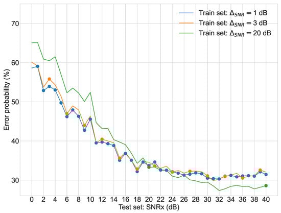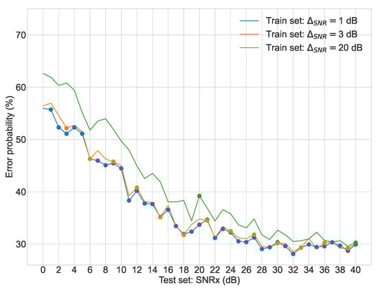 For each type of scenario, the procedure described in Section 4 is followed using the virtual enlargement parameters = 1 dB and = 40 dB. Twenty different training sets/models are created with different values ranging from = 1 to = 20. For each of these 20 models, all 41 test sets presented above are tested, and then the average error probability is calculated.