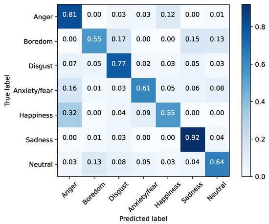 Additionally, Figure 7 shows the normalized confusion matrix for the proposed model “All scenarios = 3 dB”, tested with “Base 40 dB” on the EMO-db corpus.