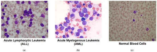 Blood cancers, named leukemias [1], can be classified as aggressive illnesses. This illness is correlated with the white blood cells (WBCs) or leukocytes; thus, the human body can be adversely affected by this disease, the blood and bone marrow in particular. The prevalence of blood cancers has been increasing annually, due to genetic factors and/or environmental factors such as the presence of chemicals, among other unknown factors [2]. Their incidence and mortality rates have been ranked as 15th and 10th for all malignant cases, respectively [3,4]. Acute leukemia can be categorized into two main classes: myeloid and lymphoid [5]. Acute lymphocytic leukemia (ALL) is the most common leukemia in children, while acute myeloid leukemia (AML) is the most common malignant blood cancer in adults [1]. Male patients are the predominant focus of cases of both ALL and AML.