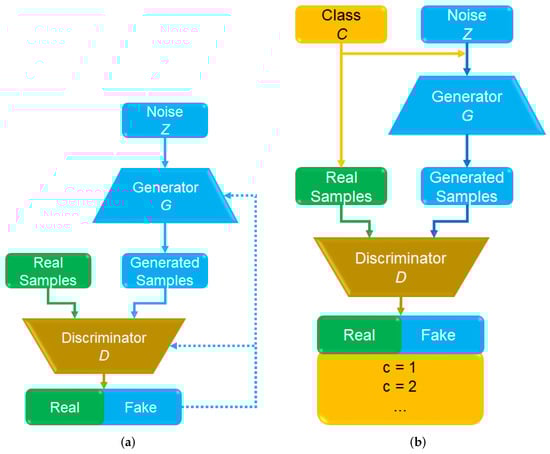 (a) Basic structures of the GAN model; and (b) the GAN with auxiliary classifier.