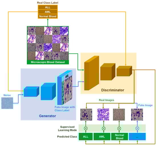 Figure 3 shows that our developed AC-GAN performs the same operations as a basic GAN. Binary classification is used to identify whether the microscopic image is real or not. Then, utilizing the unsupervised learning mode, the output of the auxiliary classifier predicts the class label matching the corresponding real blood image only. As a result, in supervised learning mode, we included the operator as a switch to handle the output of D, in order to conduct the link between real microscopic images and the true predicted class labels [47]. This eliminates the need to develop extra samples for all classes in this study, by using the same discriminator and generator, resulting in the effective identification of ALL and AML diseases for all tested blood images. We did not consider the class labels of fake images, as the generation of high-resolution synthetic microscopic images was not the goal of this study.
