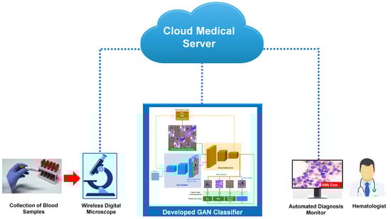 The overall framework of our proposed IoMT-based microscopic blood image diagnosis method is depicted in Figure 4. It is composed of three main stages, as follows: First, the blood samples are taken from patients and collected for leukemia tests. Based on a wireless microscopic imaging system, the blood smear images are sent to cloud medical server to provide further options. For instance, the blood samples, including dates and results, can be automatically recorded in patient medical files. Second, the acquired blood images are analyzed using our developed AC-GAN classifier, as shown in Figure 3. In our proposed framework, utilizing cloud computing services is highly recommended for the automated classification of all uploaded microscopic images, in order to lessen the required hardware resources and storage; for example, reducing the need for Graphical Processing Units (GPUs) and large memory capacities. Third, the blood diagnosis results are sent to the hematologist’s monitor or smartphone, in order to verify and finalize the blood analysis report with medical recommendations.