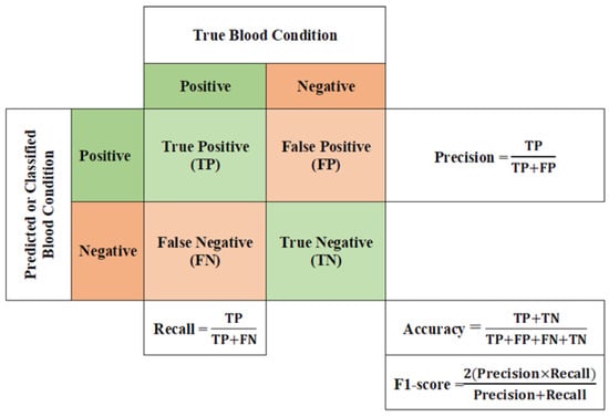 The following metrics were used to assess the performance of our AC-GAN model for classification of acute leukemias in microscopic images, based on cross-validation estimation [48]: a confusion matrix and four evaluation metrics were used, as shown in Figure 5. True positive (TP), false positive (FP), false negative (FN), and true negative (TN) are the expected outputs of the confusion matrix. The diagnosis results of hypothesis testing for each anticipated class, with respect to its true class, are reflected in these results. Accuracy is the essential metric for most image-based classifiers. It is calculated by dividing the sum of true positives (TP) and true negatives (TN) by all possible cases, as shown in Figure 5. The accuracy is usually presented as a percentage (e.g., 100%). The precision is used to describe the relationship between real positive predicted values and all positive predicted values. The recall or sensitivity gives the ratio between the predicted TP value and the sum of predicted TP and FN values. The F1-score is the fourth evaluation metric, which includes the double ratio of recall and precision metrics. In addition, the classification performance of our developed GAN model was compared with those of existing transfer learning models, including DenseNet-121 [49], ResNet-50 [50], and VGG-16 [51]. Moreover, a comparison with other deep learning models from previous studies was also carried out, in order to verify the findings of this study, as presented in the following section.
