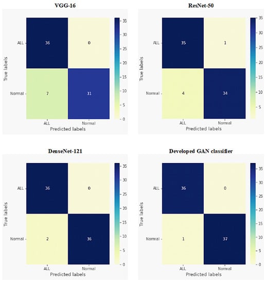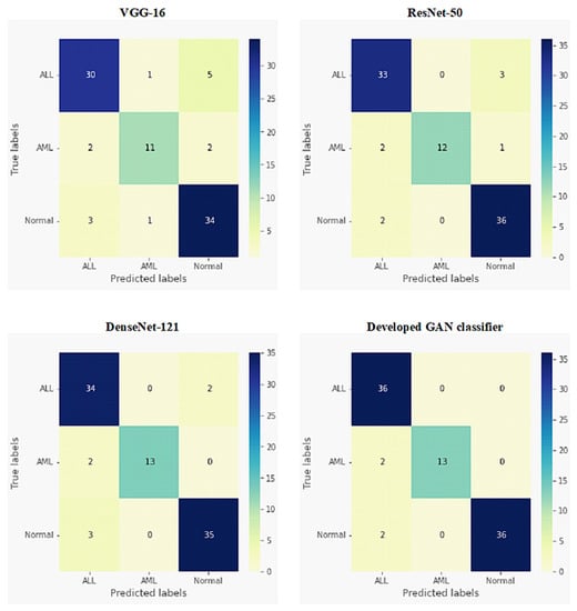 The confusion matrices for both binary classification and multi-class classification of ALL, AML, and normal blood conditions are depicted in Figure 6 and Figure 7, respectively. These results were achieved by our developed GAN classifier and three transfer learning models: VGG-16, ResNet-50, and DenseNet-121. For the binary classification (ALL or normal) results shown in Figure 6, the developed GAN model showed the highest accuracy score, with one misclassified normal case sample. Similarly, DenseNet-121 achieved accurate results, but had two misclassified images for the normal class. ResNet-50 and VGG-16 showed moderate and worse performances, respectively, when identifying ALL and normal blood conditions. As shown in Figure 7, the developed GAN presented the best accuracy for the three-class (ALL, AML and normal blood) classification, with four misclassified samples (i.e., two AML images and two normal case images). The VGG-16 model failed to achieve the multi-class classification task precisely.