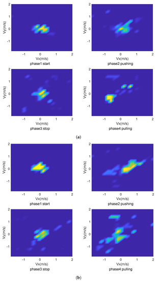 where and are determined by the location of the corresponding transceiver link. Derived from , refers to the user’s face orientation, and refers to the vertical direction [24]. Therefore, and can be used to solve the possible values of and , calculate , solve the optimal solution of , and with the measurement DFS isolated from the CSI measurement [25]. Body-coordinate velocity profile (BVP) can be represented by and . Different users perform the same action with different patterns; taking push and pull as an example, as shown in Figure 1, different users at different phases of the same gesture have different power distribution of speed components and different execution duration.