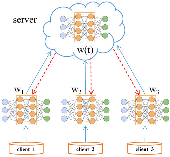 The training process of federated learning is shown in Figure 2. The server collects the model parameters uploaded by each client in each iteration, and then distributes them to each client after weighted averaging to complete the update of local model parameters.