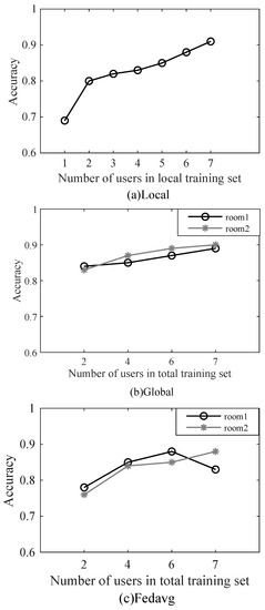 Finally, we verify our conjecture using FedAvg, a classic algorithm for federated learning. The two rooms each represent a client that learns the model on the local training set, and an additional server is responsible for fusing their model parameters. The result is shown in Figure 3c: as the number of users increases, the accuracy of room2 can exceed 0.9, while the accuracy of room1 decreases after reaching a certain value. According to the description in Reference [21], this is caused by the data heterogeneity in the local data of two room users. This result shows that FedAvg is difficult to adapt to the complex data structure. When the user’s local data are biased, the server-side global model may perform well, while the user’s local model performs differently. The reason is that FedAvg simply weights and averages the local model parameters of each user to achieve overall high accuracy, while ignoring the differences in the characteristics of each local model for its data.