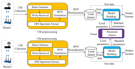 The CSI preprocessing block extracts DFS from collected raw CSI measurements, and generates BVP from the DFS spectrum. The BVP normalization block is designed to standardize the BVP series data to generate local datasets. The model building block is used to construct local models with training data from local datasets. The parameter fusion block is used to match and fuse the parameters of local models and return match parameters to local models. The gesture recognition block is responsible for distinguishing different user gestures with local models with matched parameters.