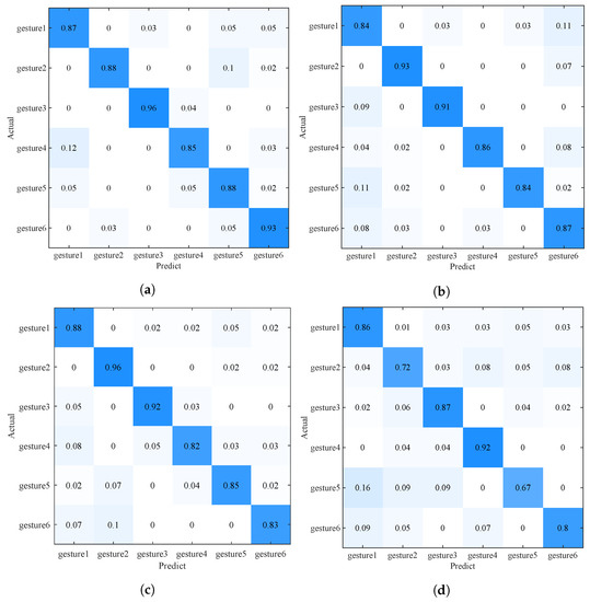 Confusion matrix of WiMA under different number of users. (a) Users number = 7, accuracy = 0.90. (b) Users number = 6, accuracy = 0.88. (c) Users number = 4, accuracy = 0.85. (d) Users number = 2, accuracy = 0.79.