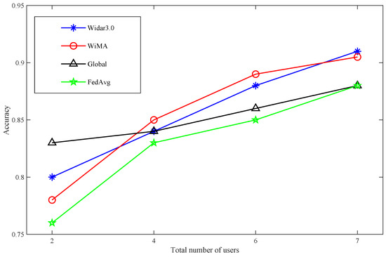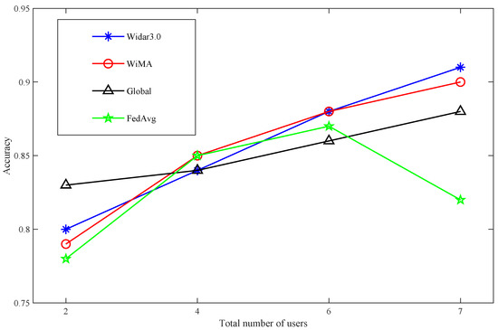 Comparison with other methods: The comparison of the accuracy of various methods with the number of users in different rooms is shown in Table 1; in order to show the results more intuitively, the same results are shown in pictures in Figure 7 and Figure 8. When the total number of users exceeds four, the accuracy of WIMA in both rooms can exceed , and when the number of users reaches seven, it reaches . Overall, WIMA can reach the standard of Widar 3.0. Its overall accuracy is better than that of Global and FedAvg, and, especially, the performance of FedAvg in room1 is much lower than that of WiMA and Widar3.0.