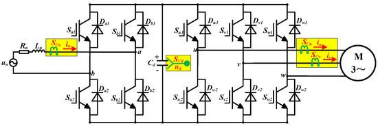 The topology of the two-level converter is shown in Figure 1, which is used to power the traction motor. There are five legs with the same structure. Every leg has two transistors and two freewheeling diodes, they are , , , and , respectively, x can be a, b, u, v, and w. , and are the traction winding leakage resistance and inductance. is the grid voltage and is the grid current. is the capacitor in the DC-link, is the DC-link voltage. and are the stator currents of the traction motor. There are a grid current sensor, a voltage sensor and two stator current sensors in the converter. Another stator current is , which is equal to the opposite of the sum of and . is the grid current sensor, is the voltage sensor in the DC-link, and are the stator current sensors.