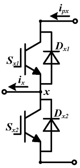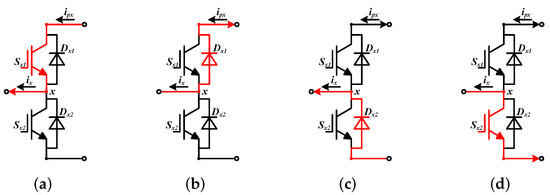 Define and are the command signals of and , respectively. The values of and can be 0 or 1. There are two kind of command signals of the leg, they are 10 and 01. When the command signals is 10, if , the current path is , which is shown in Figure 3a, is equal to . If , the current flows through , which is shown in Figure 3b, is equal to as well, while the command signals is 01, if , the current path is , it is given in Figure 3c, is zero. If , the current flows through , it is shown in Figure 3d, is zero too.