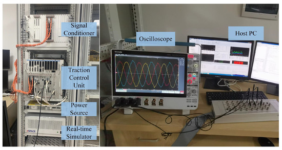 Due to the danger which might be caused by the faulty converter and the high-voltage tests are hard to be implemented in the laboratory, the HIL tests are used to verify the correctness of the proposed fault diagnosis method. The HIL test platform is shown in Figure 4. It mainly includes a physical TCU, which is used in electrical multiple units (EMU), a real-time simulator, which is a dSPACE, and a host PC. Moreover, the power source provides power to the platform. The signal conditioner are used for voltage conversion between the TCU and real-time simulator. The oscilloscope are applied to the display of HIL results. The real-time simulator includes the 5203 board, which is an embedded Xilinx Kintex 7 field programmable gate array. The sampling period of the real-time simulator is 10 ns. The traction converter, the motor are emulated components. Both of them and the proposed fault diagnosis method are realized in the real-time simulator. The TCU is the physical component, the sampling period of it is 40 s. The control algorithm is realized in the TCU, which receives the feedback signals from the real-time simulator and sends command signals to the real-time simulator. The HIL tests are controlled by the host PC. The traction converter and motor are used in CRH3 EMU and the main parameters are given in Table 2.