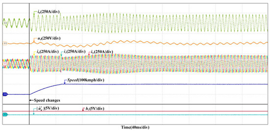 Faults in are analogous to , take as an example to show the HIL results when faults occur in stator current sensors. When an offset fault occurs in , The results are shown in Figure 14. The train speed is 200 km/h and the offset value is 10 A. After the fault occurs, gets bigger and overs the threshold, the fault is detected. Then, the changes with . When is 1, is bigger than , so the fault does not occur in . There are instants when or is 0 but is larger than , it can prove the fault does not occur in and , so the fault is located, which is in . In half a current period, there are no instants when is 1 and is less than . does not change periodically and the fault type is determined, which is an offset fault. Figure 15 are the results of an offset fault in at 300 km/h and the offset value is 10 A. The fault diagnosis process is similar and omitted.
